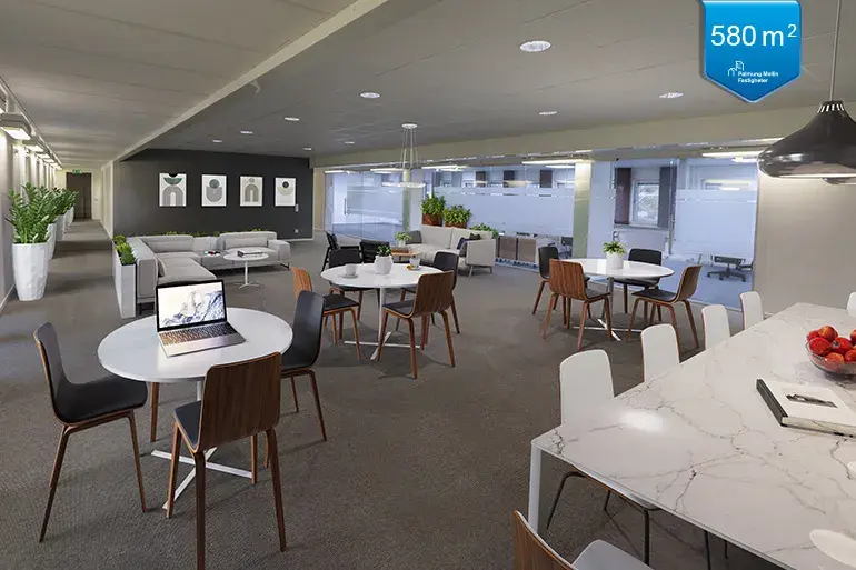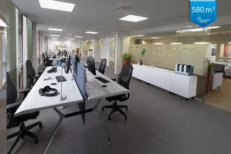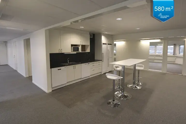 Modern och öppen kontorslokal på 580 kvadratmeter. En blandning av kontorsrum och öppna kontorsytor skapar en luftig känsla i lokalen och möjlighet till många arbetsplatser.